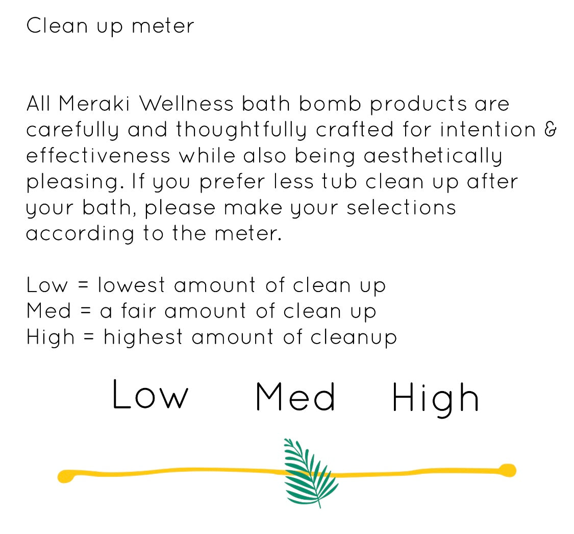 *All Meraki Wellness bath bomb products are carefully and thoughtfully crafted for intention & effectiveness while also being aesthetically pleasing. If you don’t care to clean up the plant matter after use of the bath bombs please add a note at checkout to not add flowers or remove them prior to use. Thank you!
